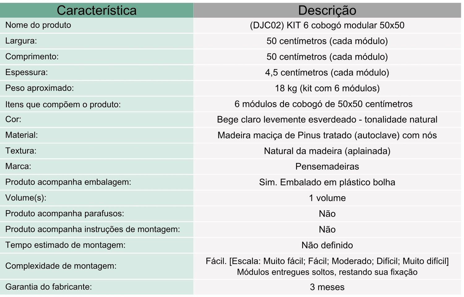 O kit é composto por 6 peças de cobogó/muxarabi ou ainda (elemento vazado) de 50x50 centímetros. As peças são modulares e podem ser usadas na posição vertical ou horizontal. Para montar, posicione os módulos um sobre o outro, e utilize pregos ou parafusos para sua fixação.
