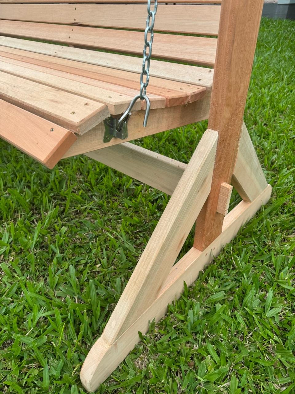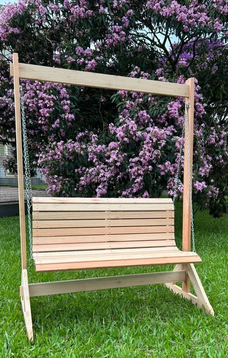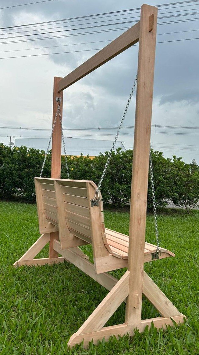Pérgola de madeira maciça, com banco em balanço, sustentado por corrente de aço. Produto resistente e durável.